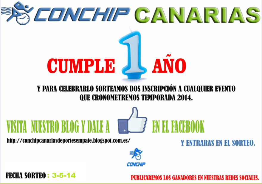 Conchip Canarias cumple un año y queremos celebrarlo contigo, y queremos premiarte con una inscripción gratuita a cualquiera carrera que cronometremos este 2014.